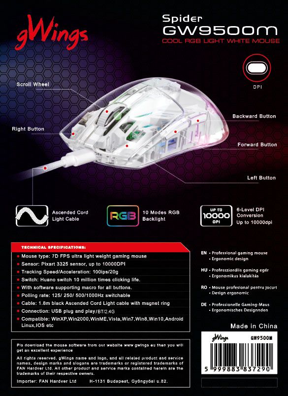 A gWings 9500 egér átlátszó borításán keresztül bepillanthatunk az egér belsejébe és mindezt egy divatos, tetszőlegesen kiválasztott, RGB háttérrel.