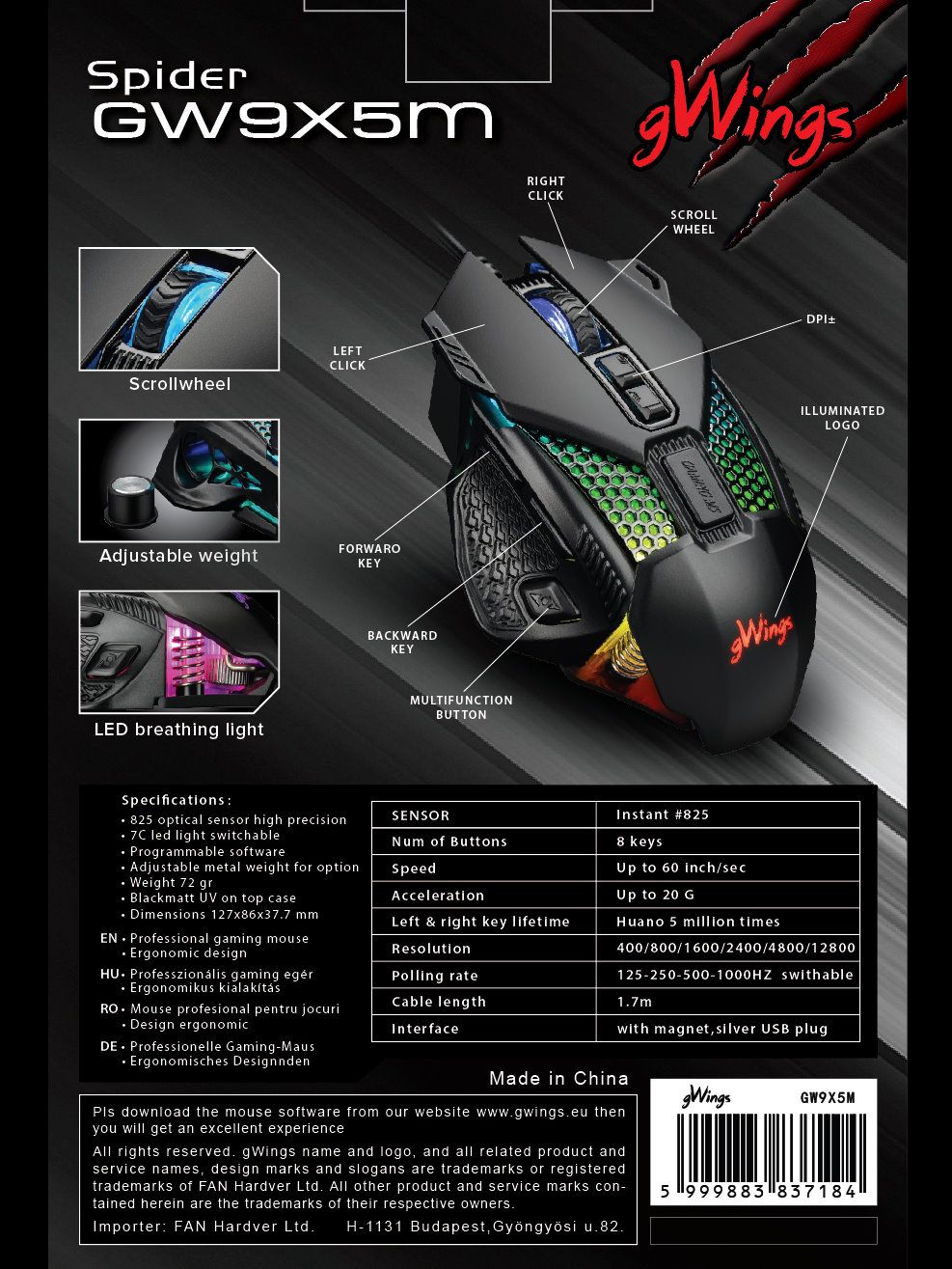 Mit tud? A GW9x5m egerünk lelke egy Instant #825 típusú processzor, amely max. 12.800 DPI felbontásra és 1000 Hz mintavételezésre ad lehetőséget. A letapogatás paramétereit a saját, letölthető szoftvere felületén lehet látványosan elvégezni.